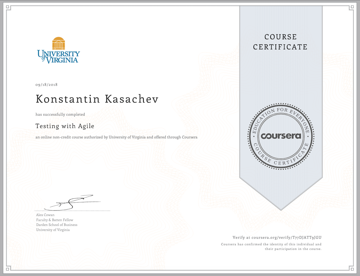 - Закончил курс Testing with Agile, хотя никаких особых знаний по итогам прохождения не осталось. Пока самая бестолковая и нудная специализация на курсере.