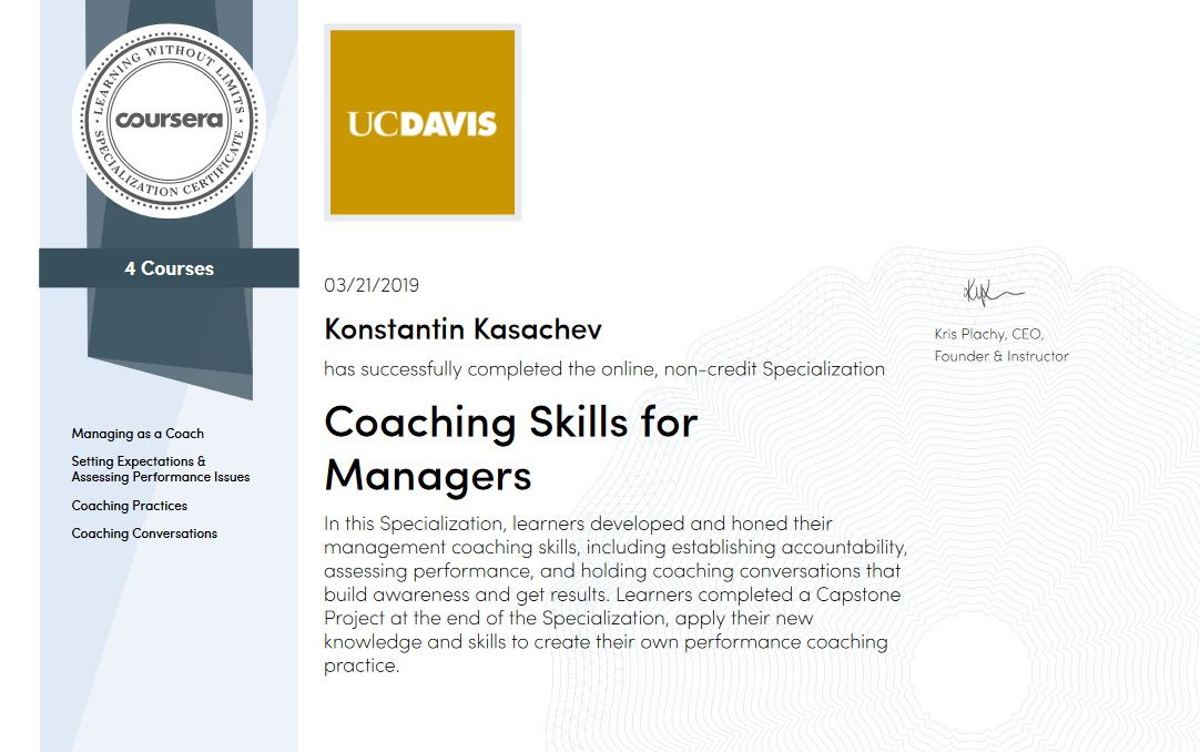 14.03 — Сдал последнее задание по специализации Coaching Skills for Managers. Потом долго ждал пока его проверят, т.к. немного, похоже, других людей эту специализацию дошли до конца. Там было суровое финальное задание.