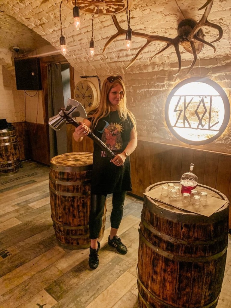 В то самое первое наше посещение на входе стояли схожие бочка, графин и валькирия, и всем входящим наливали стопку настойки. Каждый коктейль мне выносили очень эффектно и сопровождали легендой.