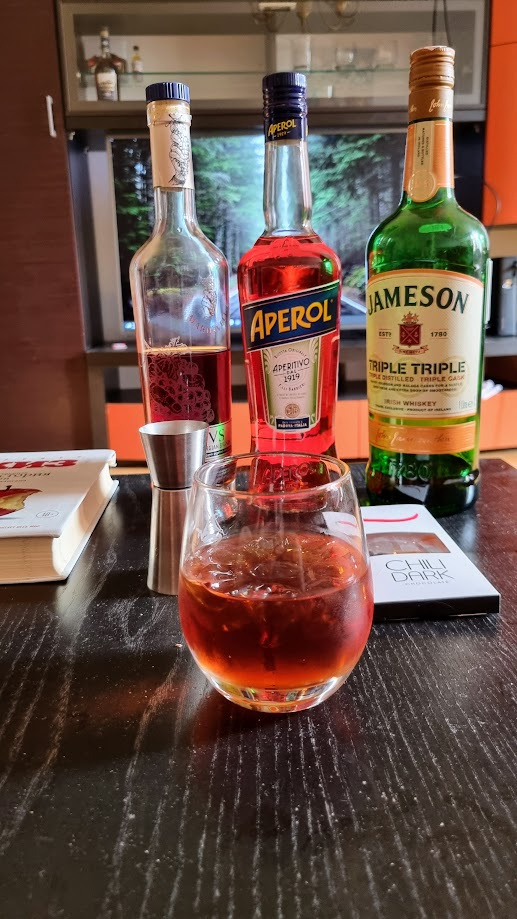 Пока пришёл к относительно неплохому сочетанию — коньяк, виски, апероль в сочетании 1:1:1, немного сиропа (в наличии оказался только клубничный), лимон и лёд. Но не хватает, конечно, ореховых ноток.