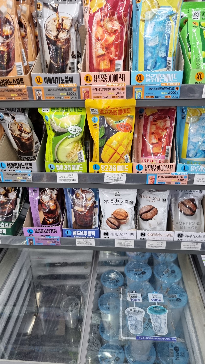 А ещё местные очень любят холодные напитки со льдом. В кофейнях покупают в основном Ice Latte, а в магазинах продают стаканы со льдом и отдельно — пакетики с соками/кофе или ещё какими жидкостями для заливки в эти стаканы.